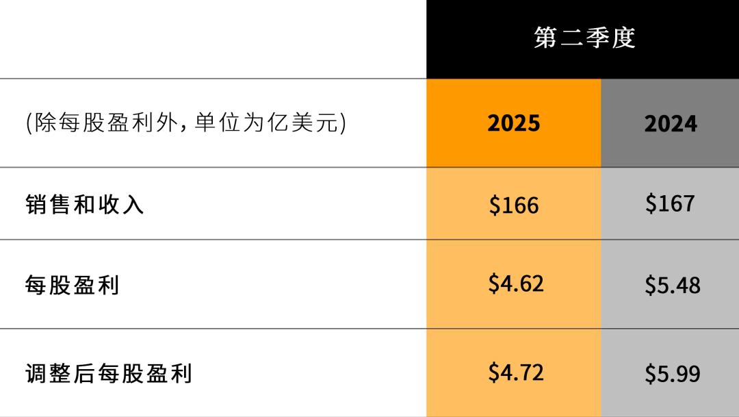 2025年第二季度營業(yè)利潤率為17.3%,而2024年第二季度為20.9%。2025年第二季度調(diào)整后營業(yè)利潤率為17.6%,而2024年第二季度為22.4%。2025年第二季度每股盈利為4.62美元,而2024年第二季度每股盈利為5.48美元。2025年第二季度調(diào)整后每股盈利為4.72美元,而2024年第二季度調(diào)整后每股盈利為5.99美元。2025年第二季度和2024年第二季度,調(diào)整后營業(yè)利潤率和調(diào)整后每股盈利均不包括重組成本。